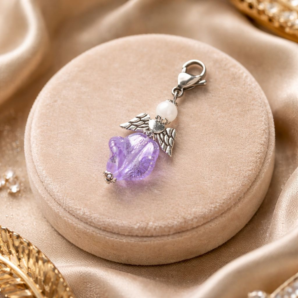 Jemný anděl s jadeitem a ručně designovanou perlou Lampglas je talismanem pro štěstí, který přináší klid, ochranu a harmonii do každodenních okamžiků.