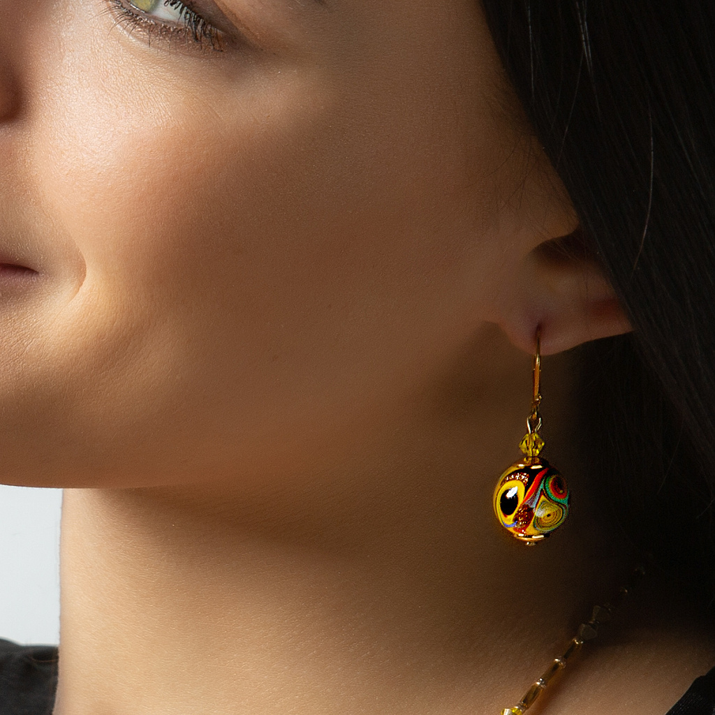 A cheerful mind, half health, it is not said for nothing. If you need a little boost to your natural optimism, try a pair of these cheerful earrings. Each of the glass beads accommodated a whole palette of colours, hand drawn into an original design with delicate strokes of hot glass and aventurine. Add them to your work suit or summer dress and forget about the gloom and worries.