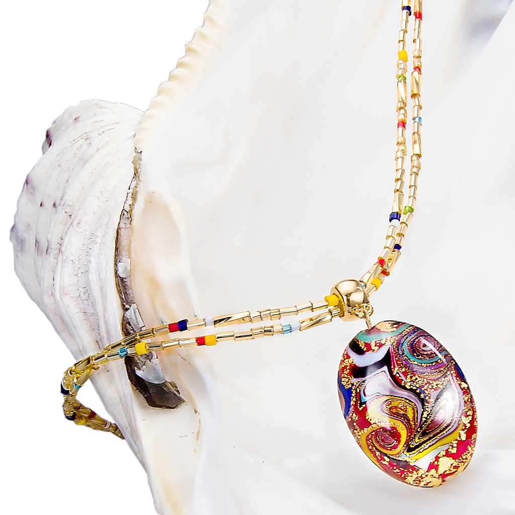 A gorgeous Lampglas pearl necklace with masterfully coordinated colors that will light up not only your cleavage, but also the smiles of you and those around you. The pearl is illuminated with a 24kt gold leaf. The chain of the necklace is made of strong rope, decorated with glass elements in gold, red and blue. Very popular model from Mystic Art collection.