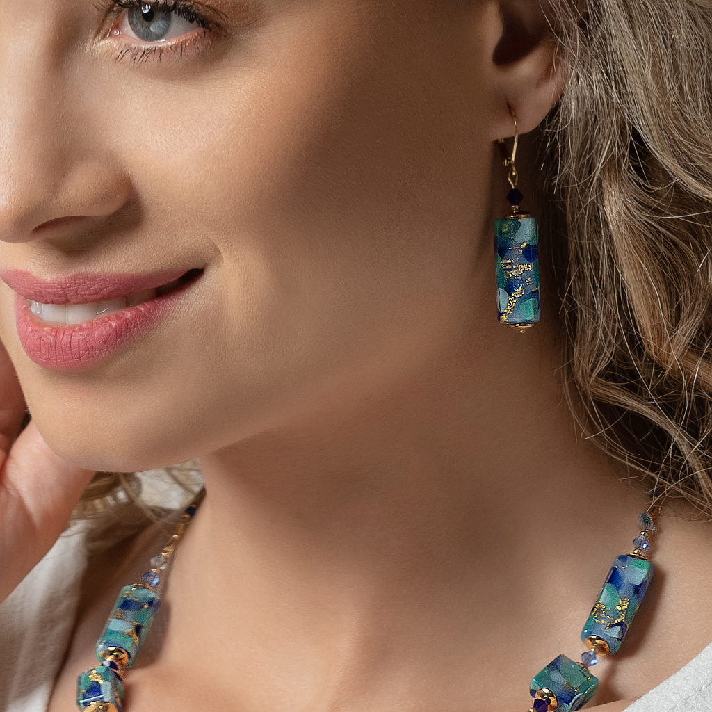 With these earrings you will definitely not be an ice queen. Blue is represented in shades that not only don't get cold, but also complement each other perfectly. If even that were not enough, turn the glass blocks slowly from side to side: the light reflecting off the 24-carat gold scales will convince you. In your hand you are holding a jewel that will not leave anyone cold.