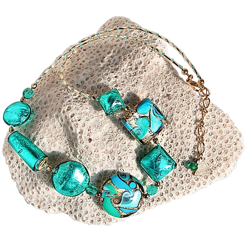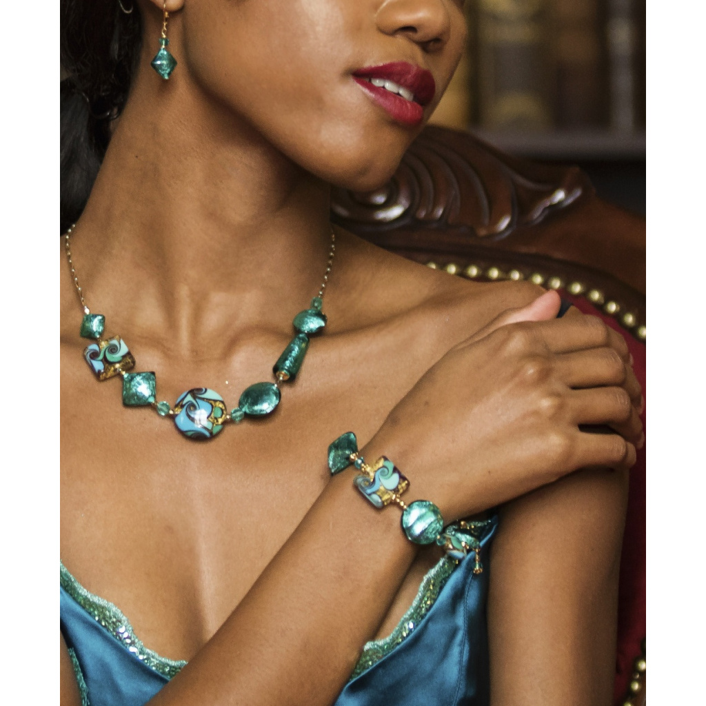 Emerald Princess necklace set with Lampglas pearls in emerald and blue shades with pieces of pure gold and silver inside.