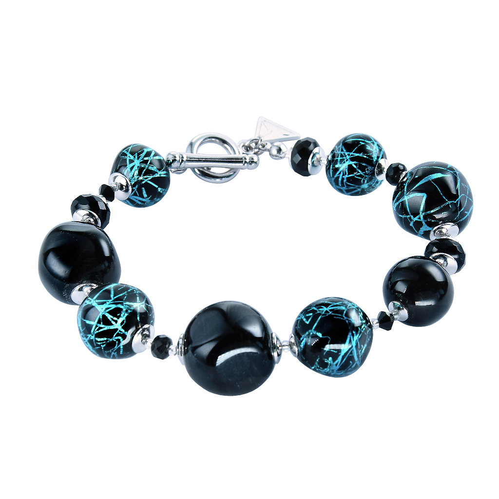 Fascinating glass pearl bracelet in black and turquoise with pure silver for the woman who is not afraid of attention.