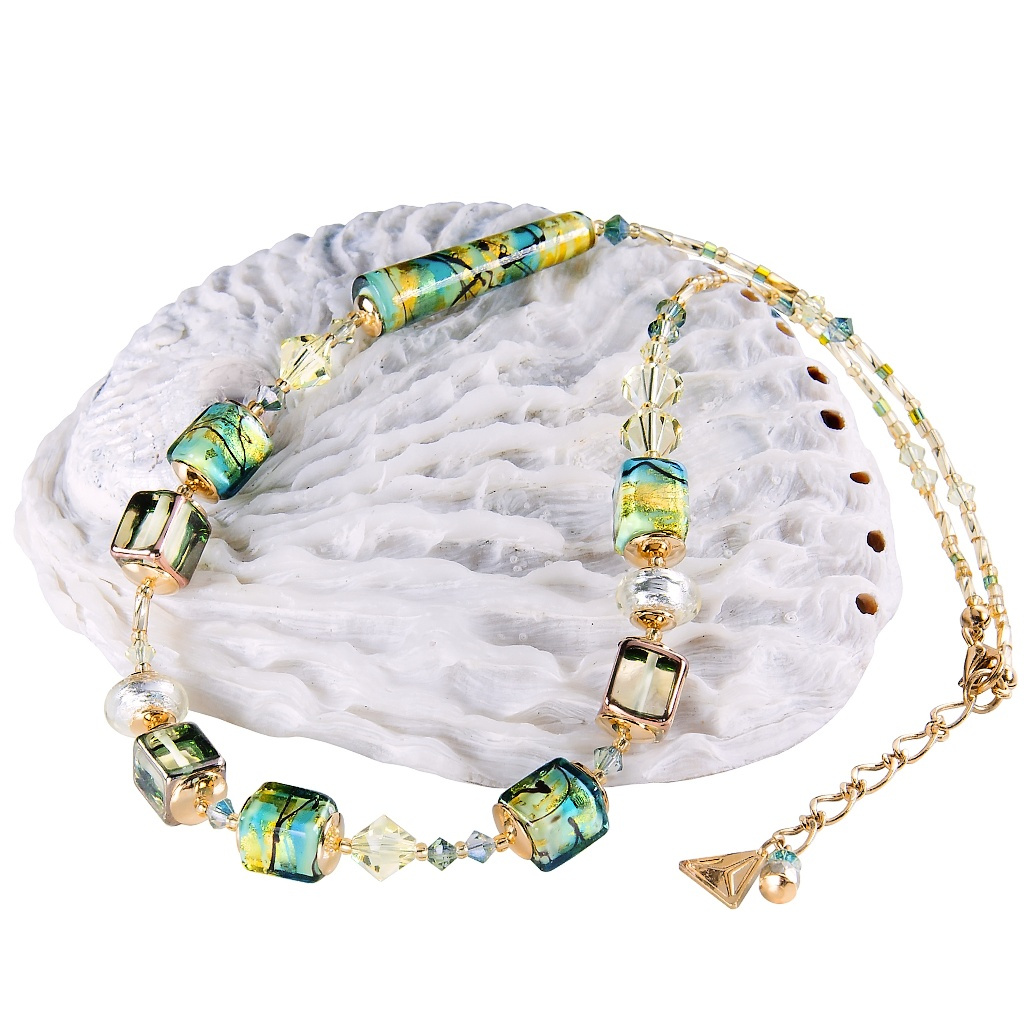 The necklace, inspired by vineyards laden with ripening grapes, evokes the atmosphere of the summer's farewell. In the glass cubes and the dominant roller, all the colours of the coming vintage seem to freeze, so you can enjoy them all year round. We've decorated them for you with a portion of pure gold and silver and hot glass, and the result is a piece of jewellery you don't have to be ashamed of wherever you go.
