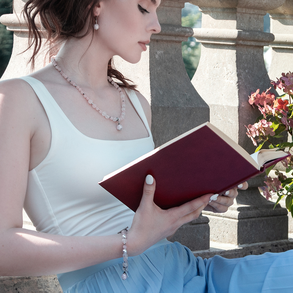 Náramek Tender Rose s ryzím stříbrem v perlách Lampglas, růženínem, hematitem a chirurgickou ocelí