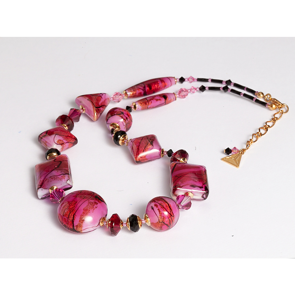 Does the sight of this beautiful necklace make you drool? Glass pearls in the colour of just ripening berries alternate in elaborate shapes on a simple chain, each adorned with a generous portion of pure gold in glass. Add a unique hot-glass drawing and a garment that reveals a good chunk of your cleavage, and go get laid.