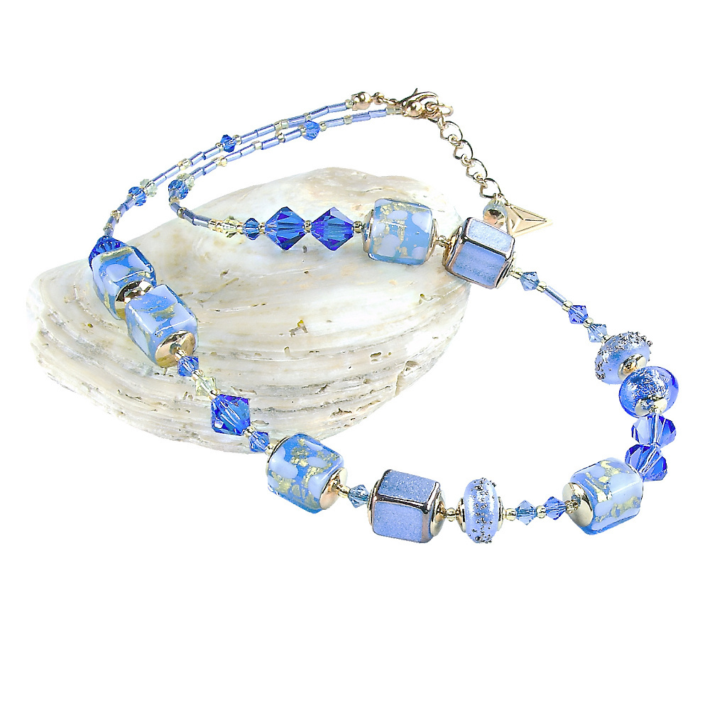 A celestial pearl necklace in shades of blue with Lampglas pearls in pure metals for the woman who longs to float on a cloud.