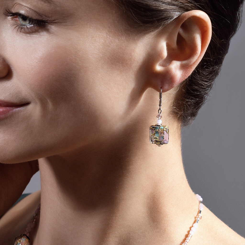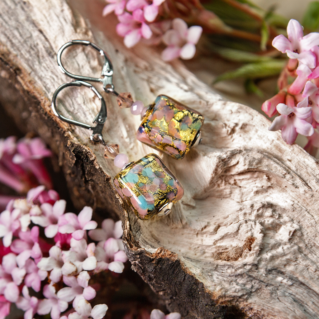 Morning to work, evening to the theater. Whenever, wherever and whatever you wear a pair of these gorgeous earrings, be prepared for attention. A pair of crystal cubes in a pink shade is decorated with a design drawing in hot glass and a portion of gold, which will leave you in no doubt about the value of the jewel. Hang it in your ears, lift your chin, straighten your back... and step into the spotlight!