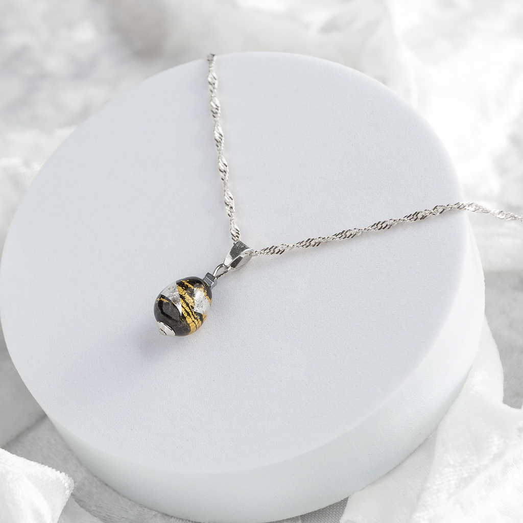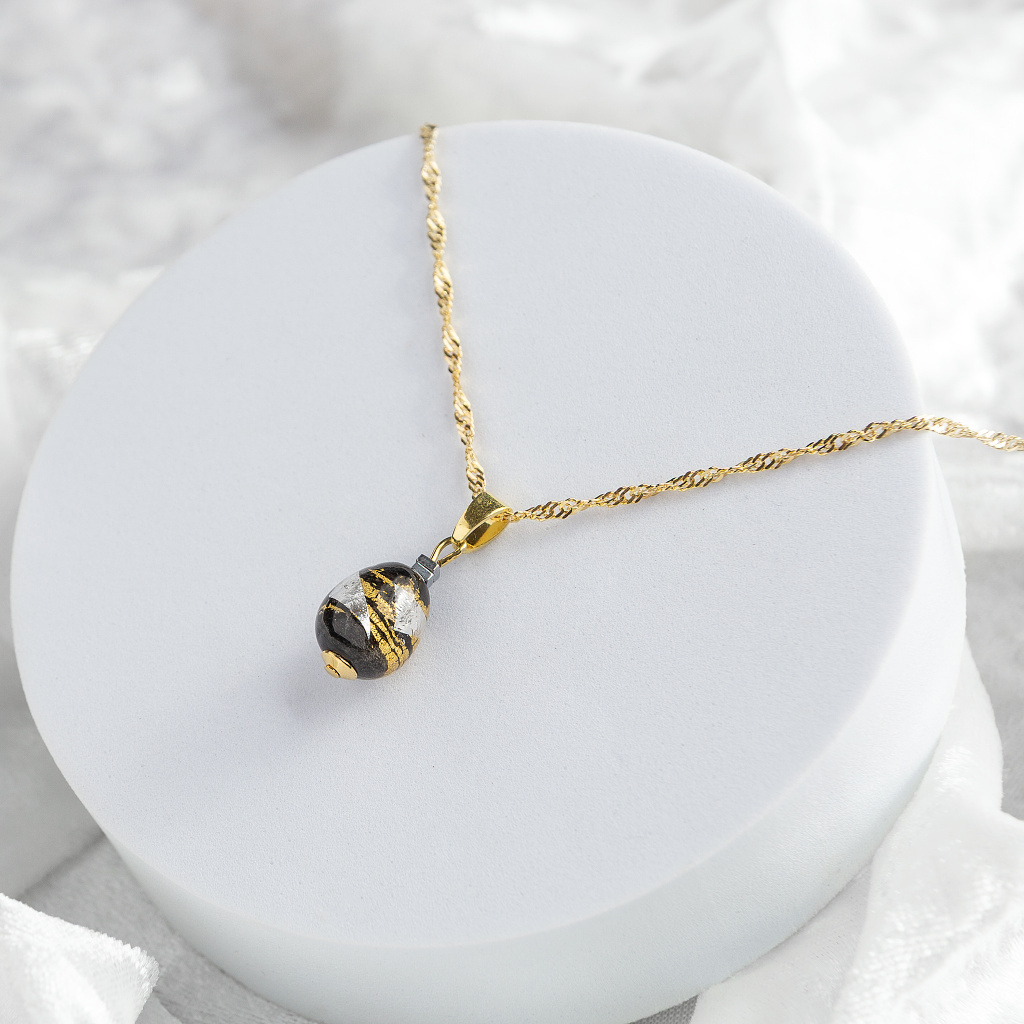 The Obsidian Nude necklace from the Nude Muse collection embodies the balance between dark depth and dazzling brilliance. In the Lampglas pearl, hand-wound by master glassblowers, the eternal power of contrast is reflected: dark black, as a symbol of inner resilience, embraces radiant flakes of 24-carat gold and pure silver, which shimmer in transparent Czech crystal.
