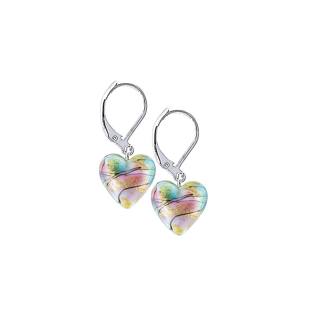 Cheerful earrings with glass hearts, decorated with hot glass and pure gold, for the lover of colour.