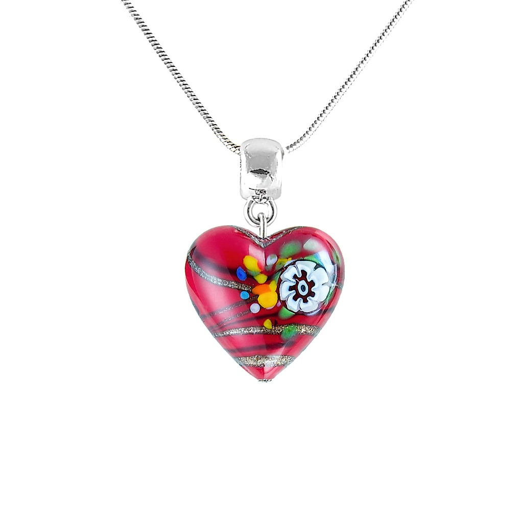Our designer has dressed a heart made of Czech glass in a colour as red as blood, which you will love. The pendant on a straight rhodium-plated chain is decorated with an original drawing in hot glass and aventurine and a flower as fresh as the wearer herself. Hang it in the cleavage and pSaveand leaveprepareto be admired.