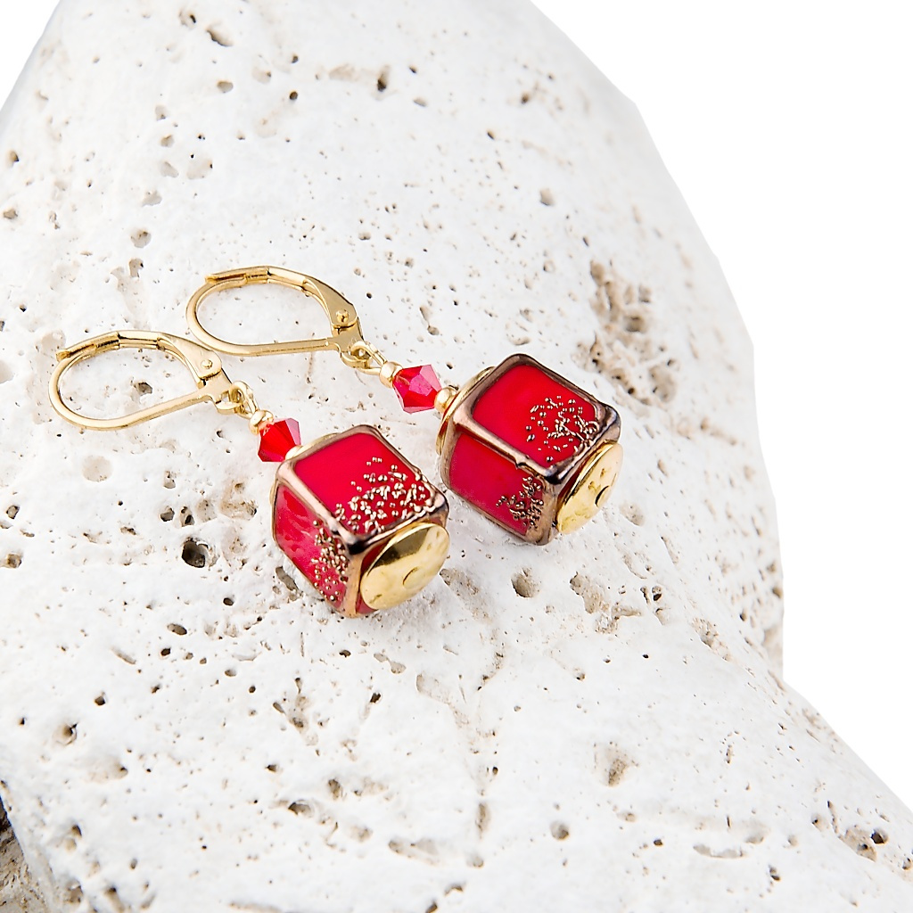 Red earrings made of spectacular lampwork pearls are lined with a special line in copper color and candied with special jewelry decoration Lampglas.