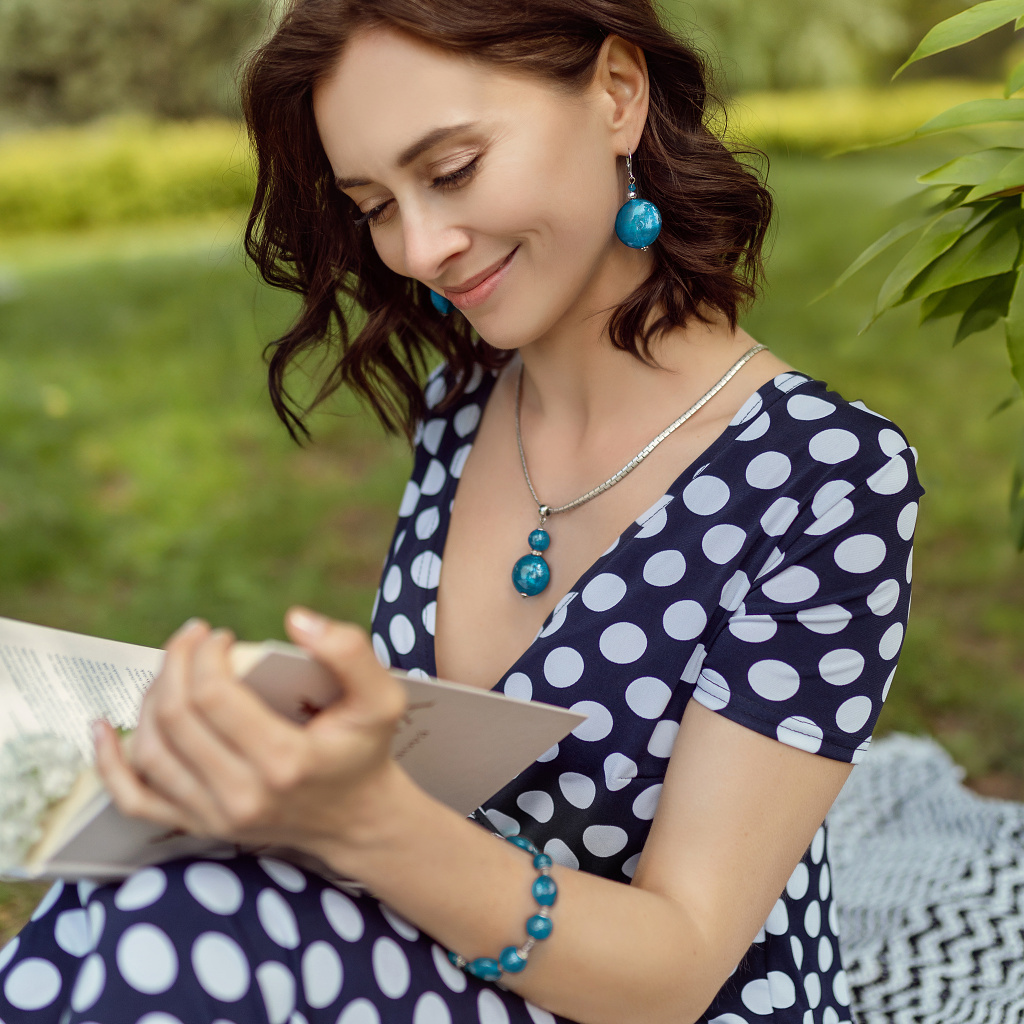Jako modrý samet je náhrdelník stvořený speciálně pro dekolt, který se nezalekne obdivných pohledů. Dvojice na sebe postavených perel z kvalitního českého skla se oděla do honosného odstínu s odlesky v populární tyrkysové barvě. Šupinky ryzího stříbra v jejich nitru odráží světlo jako zrcadlo a už tak neodolatelnému šperku dodávají na hodnotě. Řetízek je přímočarý, ale pevný – zvolíte rhodiovaný kov, nebo chirurgickou ocel?