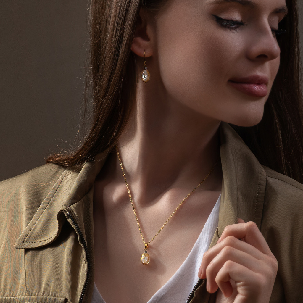Zlatavý nádech doplňuje řetízek z pozlaceného stříbra (nebo dle přání zákaznice z rhodiovaného stříbra). Výsledek je lehký, zářivý a vkusně ženský šperk vhodný pro každodenní nošení i výjimečné chvíle.
