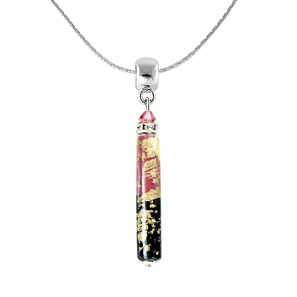 Ani Růženka by se nemusela stydět za jemný rhodiovaný řetízek, na jehož konci se pohupuje skleněná perla v těchto překrásných odstínech. Přechod mezi sytě koralínovou a temně černou krásně zjemňují nepravidelné plátky ryzího zlata, které zazáří stejně jako jejich nositelka – ať už náhrdelníkem doplní pracovní kostýmek, nebo večerní šaty.