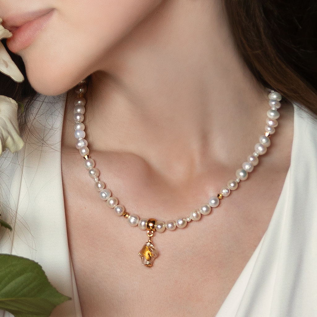 Náhrdelník Gold Whisper je ztělesněním tiché noblesy. Jeho jemně nepravidelné říční perly působí přirozeně a čistě – jako kapky světla na hedvábném vlákně. Dominantním prvkem je pak ručně vyrobená perla Lampglas z českého křišťálu, v jejímž nitru září pravé 24karátové zlato. Zavěšená jako zlatý šepot podél perlové linie, tvoří dokonalý střed tohoto výjimečného šperku.
