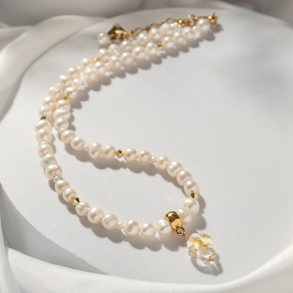 Jemný šepot zlata a perel – náhrdelník, v němž se říční perly snoubí s českým křišťálem a 24karátovým zlatem v jedinečné Lampglas perle.