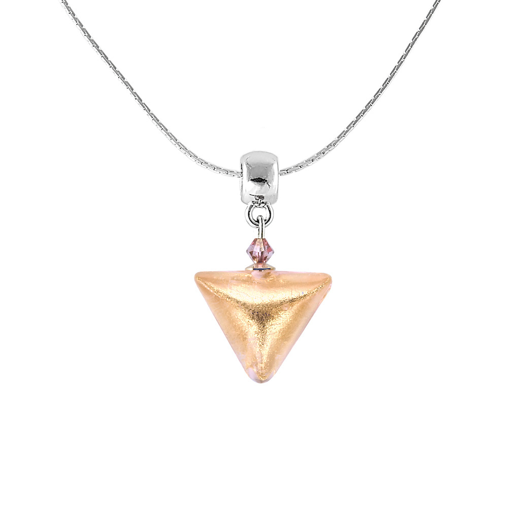 Pro ženu, která se nespokojí jen tak s něčím, jsme stvořili tento přepychový náhrdelník. Ve skleněné perle důmyslně kombinuje vše, co si jen jeho nositelka může přát: neortodoxní tvar trojúhelníku, odstíny sytě zlaté a jemně růžové i ryzí kov zapracovaný do horkého skla. Krásně doplní formální i volnočasový oděv a parádu udělá na plese, v divadle i při procházce po městě.