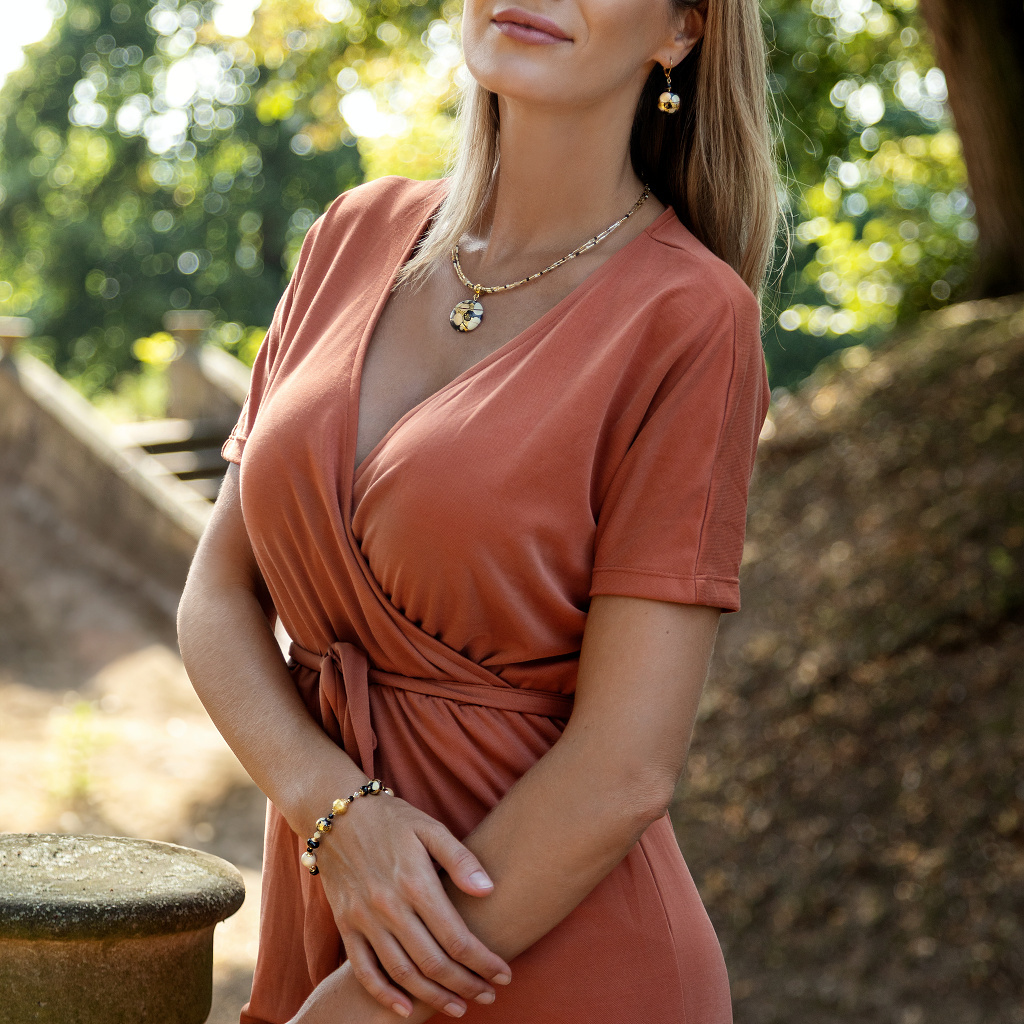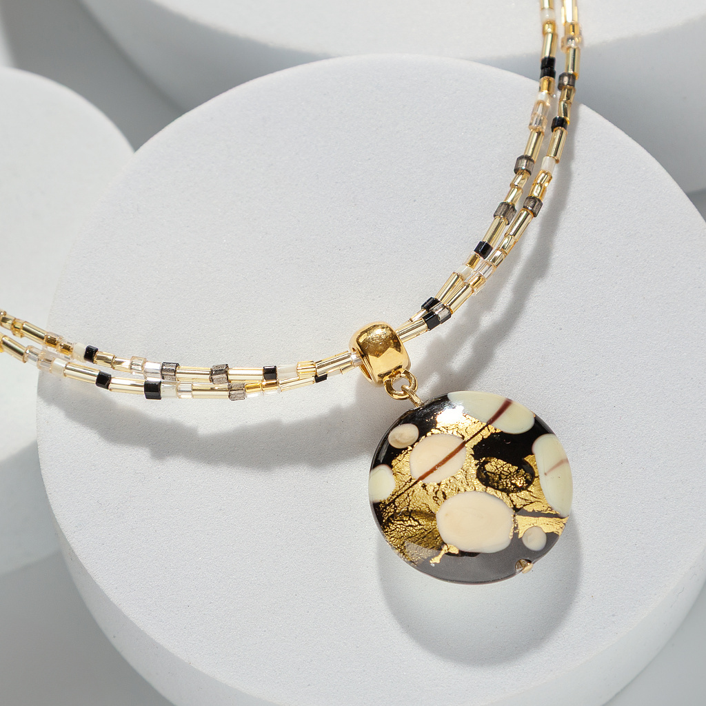 Trojitý zlatavý řetízek z jemných skleněných válečků objímá tuto zlatou perlu jako lehká záře – při každém pohybu odráží světlo s hedvábnou jemností. Kontrast slonovinových, černých a zlatých tónů vytváří harmonii, která působí nadčasově, umělecky a přitom velmi žensky.