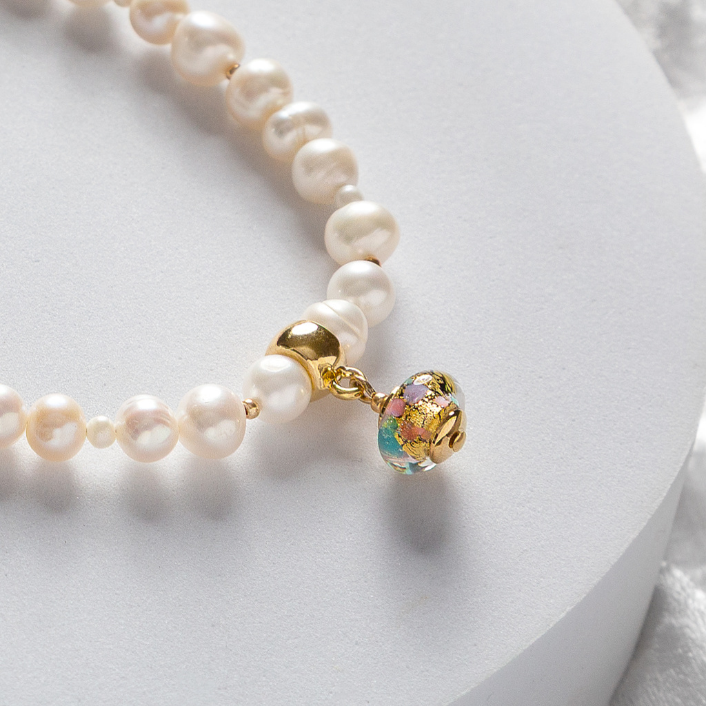 Elegantní spojení pravých perel a ručně designované perly Lampglas zdobené 24karátovým zlatem vytváří šperk plný noblesy a jemného luxusu.