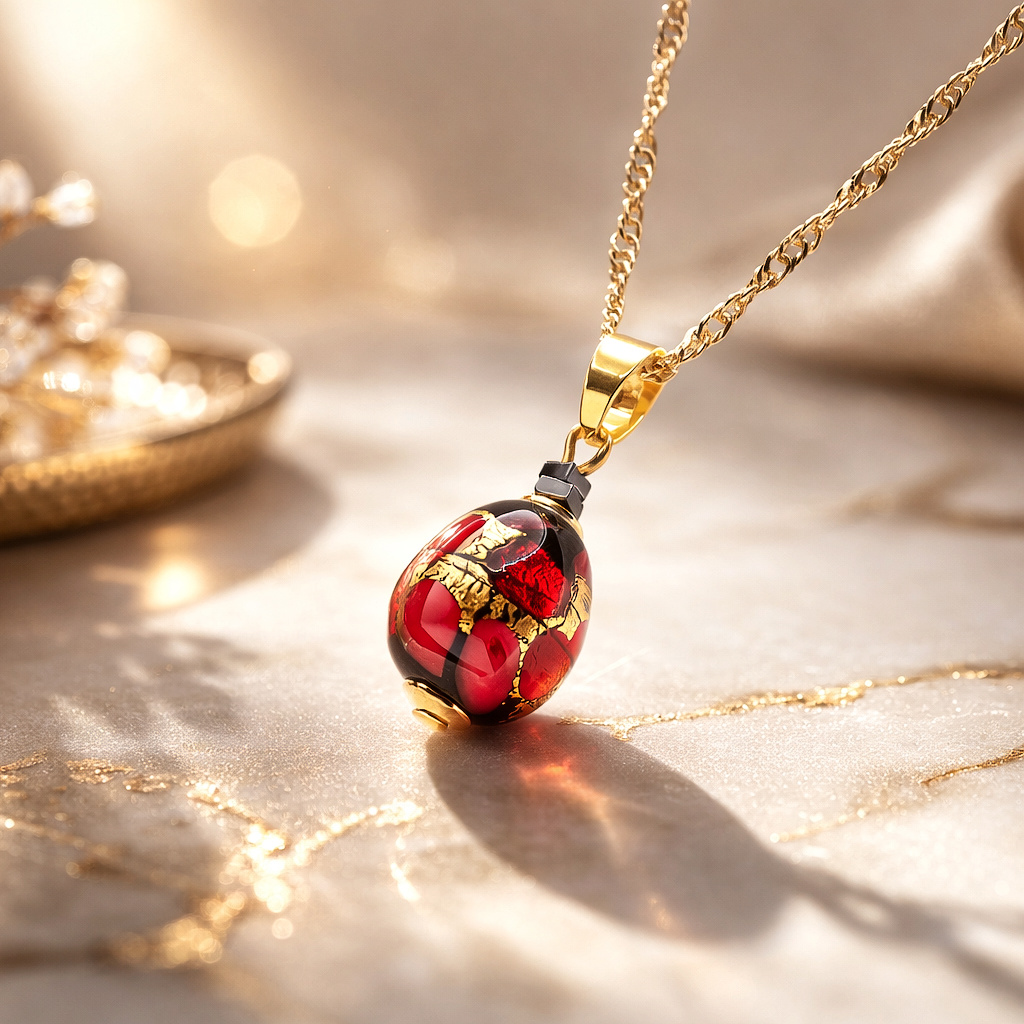 Náhrdelník Vermilion Nude je šperkem, který si bere slovo dřív, než to stihnete udělat vy – a říká přesně to, co je třeba. Nad ohněm ručně vytvořená perla Lampglas v sytě červeném odstínu vermilionu je protkána 24karátovým zlatem, které jí dodává hloubku, jiskru a noblesu. Každá perla je originál, vzniklý precizní ruční prací českých sklářů.