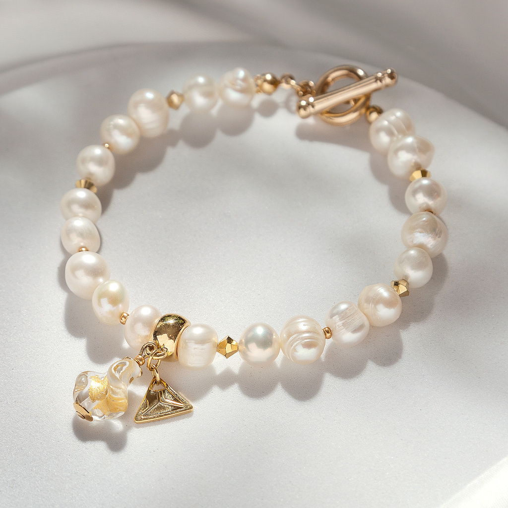 Náramek Gold Whisper je ztělesněním ladnosti v každém detailu. Rytmus jemných říčních perel přirozeně vede k perle Lampglas z českého křišťálu, v jejímž nitru září pravé 24karátové zlato. Tento středobod šperku působí jako tiché zlato – zachycené světlo v pohybu, které přitahuje pohled, aniž by křičelo.