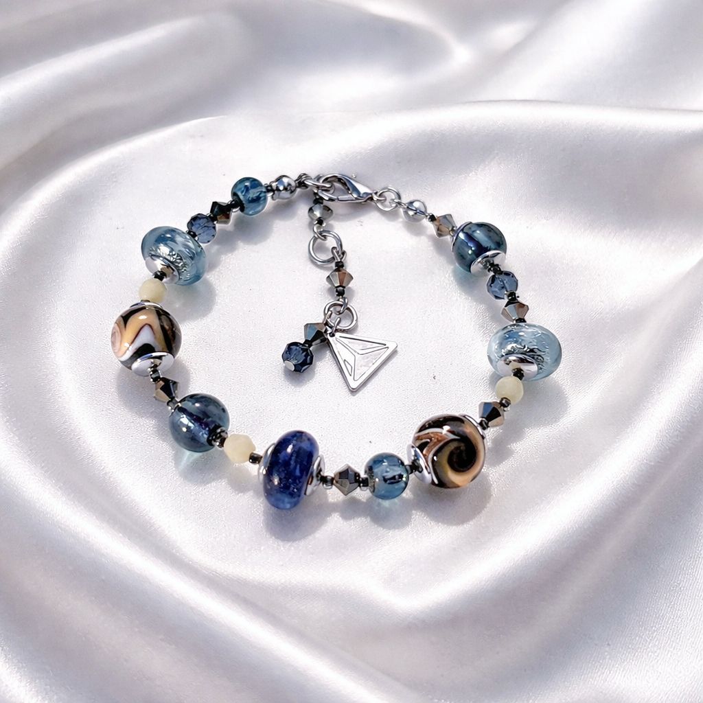 Náramek Grey Poetry je oslavou elegance, detailu a jedinečné ruční práce. Každá perla Lampglas je pečlivě vytvořena nad ohněm, kde se rodí její neopakovatelná kresba – jemné prolínání šedo-modrých a hnědých tónů doplněné třpytem avanturinu a luxusními prvky ryzího stříbra ukrytými přímo ve skle.