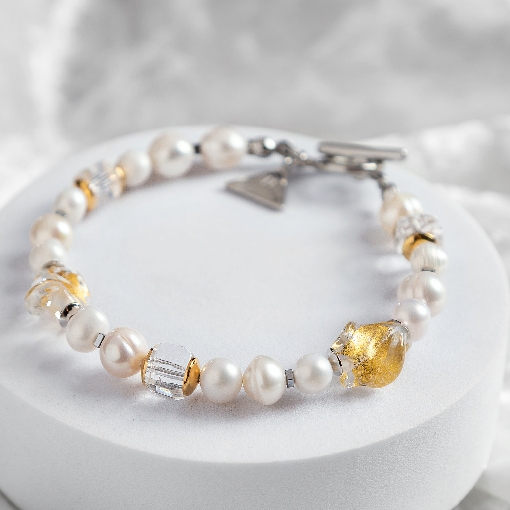Náramek Pearl Whisper je ztělesněním něžné ženskosti, romantiky a přirozené elegance. Kombinace říčních perel, jejichž smetanový lesk evokuje čistotu a klid, a ručně tvarovaných perel Lampglas s 24karátovým zlatem vytváří klenot, který působí jemně a přitom výjimečně. Křišťálové prvky odrážejí světlo do všech stran a zvýrazňují zlaté detaily uvnitř skleněných perel jako záblesky slunce v ranní rose. Tento šperk je jako něžný šepot krásy – decentní, ale nezapomenutelný.