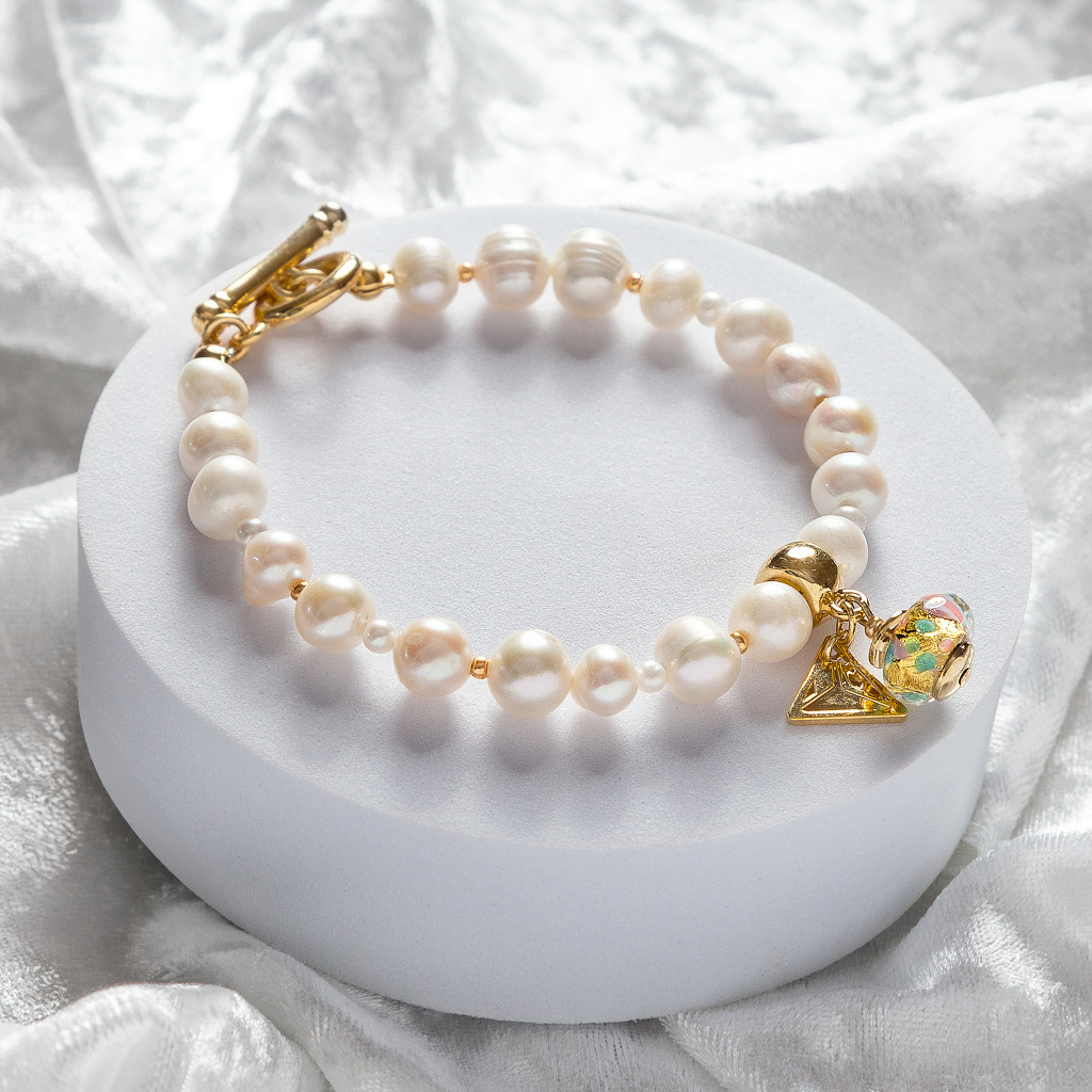 Luxusní náramek z pravých perel doplněný ručně designovanou perlou Lampglas s 24karátovým zlatem je jemným symbolem elegance a ženského půvabu.