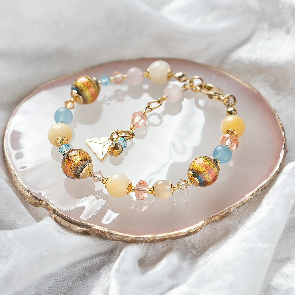 Pastelový náramek s jadeitem, kalcitem a růženínem doplněný ručně designovanými perlami Lampglas s 24karátovým zlatem, které září jemným duhovým třpytem.