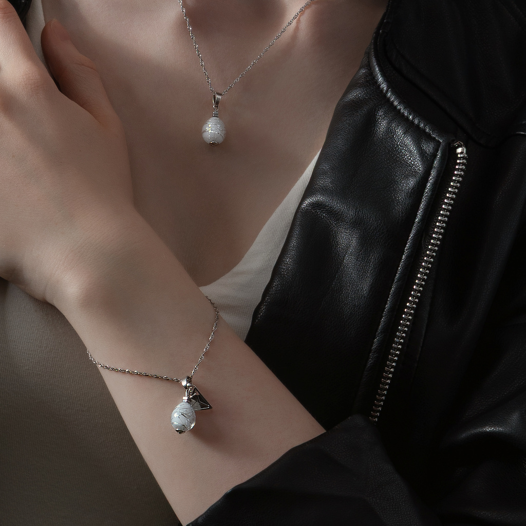 Náramek Snow Nude září jemností a čistotou. Ručně vyrobená perla Lampglas s pravým stříbrem je lehká, svěží a dokonale ladí s minimalistickým stylem i hravými kombinacemi.