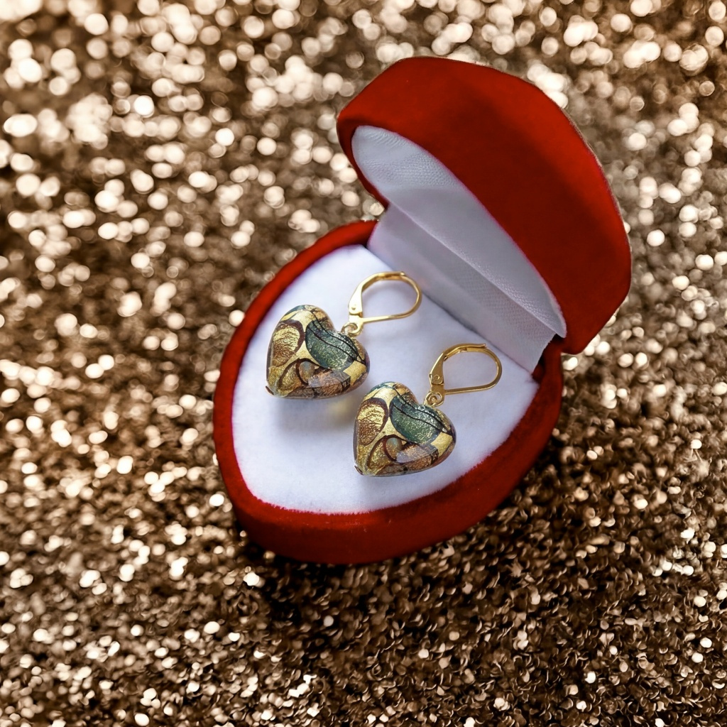Secesní náušnice s ručně designovanými perlami Lampglas ve tvaru srdce, v nichž se snoubí hloubka barev s jemným třpytem 24karátového zlata v křišťálu.