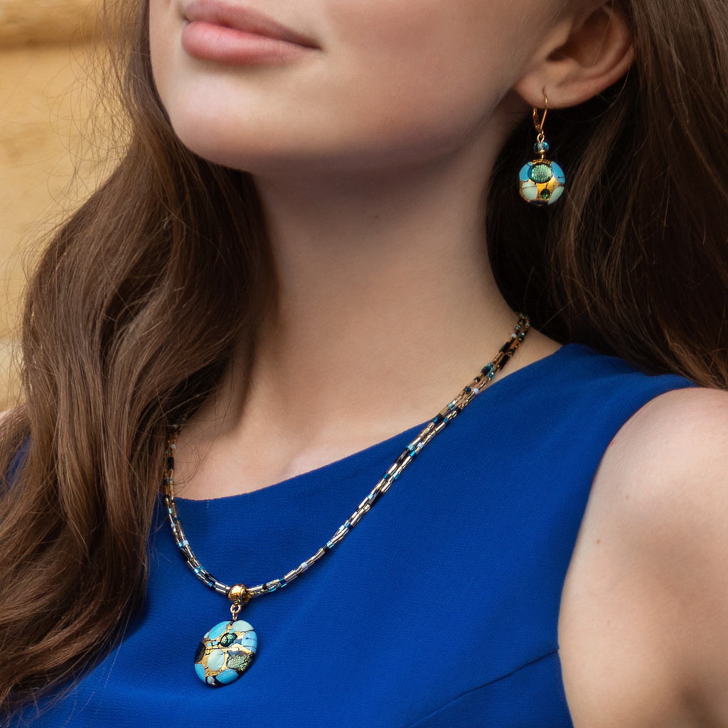 Náušnice Azure Flame vás zavedou do světa, kde se hladina oceánu dotýká slunečních paprsků. Tyrkysové tóny a zlaté odlesky se v nich spojují v harmonii, která okouzlí svou lehkostí i výrazem. Každý pohyb hlavou rozechvěje jejich třpyt a připomene krásu okamžiku.