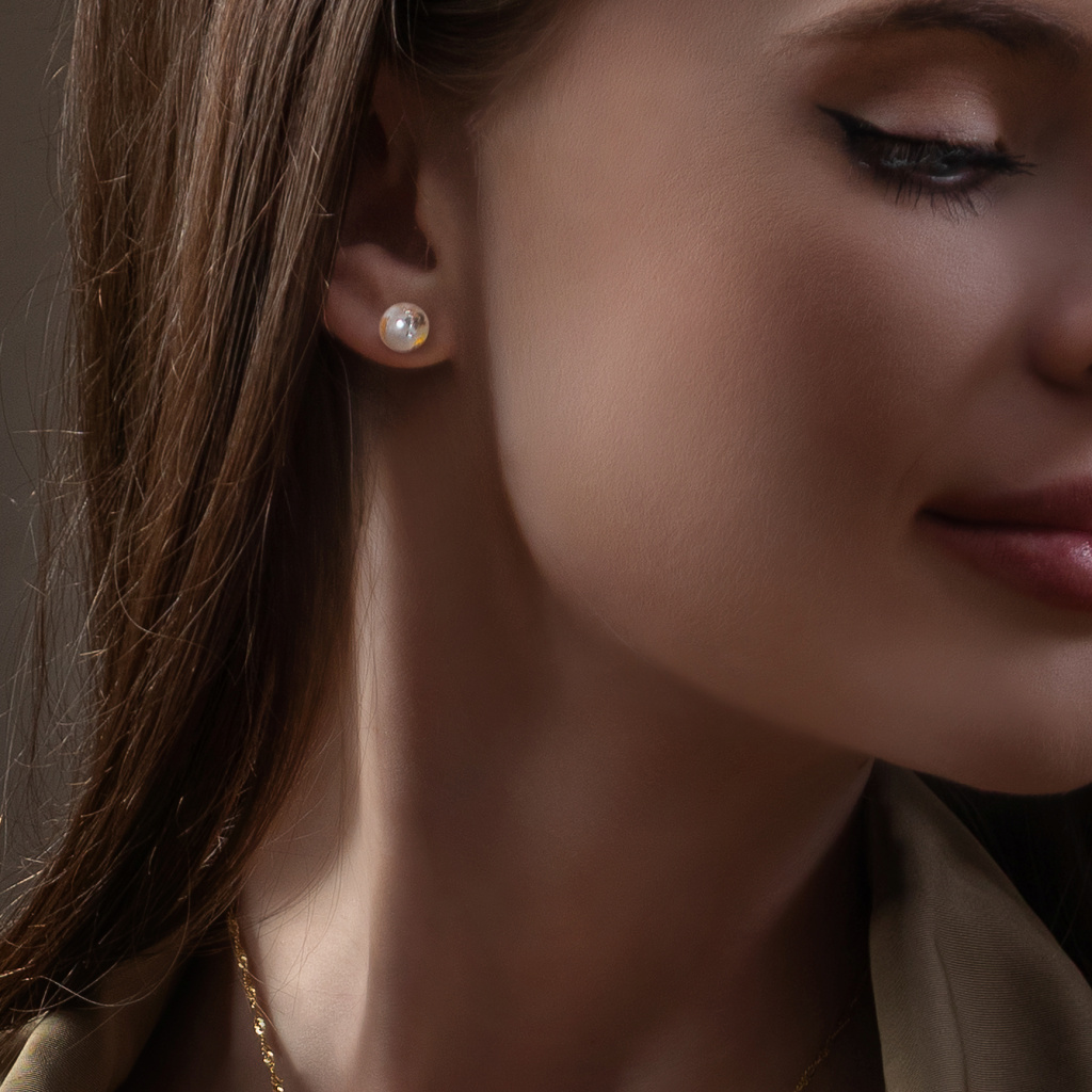 Minimalistický šperk s nádechem luxusu. Tyto puzetové náušnice z kolekce Nude Muse jsou ideální volbou pro každodenní nošení i jemné doladění slavnostního vzhledu. Vinuté perly Lampglas skrývají šupinky 24karátového zlata a ryzího stříbra v českém křišťálu a září zlatavým, krémovým tónem připomínajícím perlivé šampaňské.
