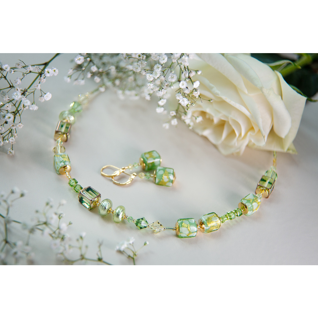 Jemné náušnice se zelenými perlami, zdobenými ryzím zlatem, pro milovnici klidu a harmonie.