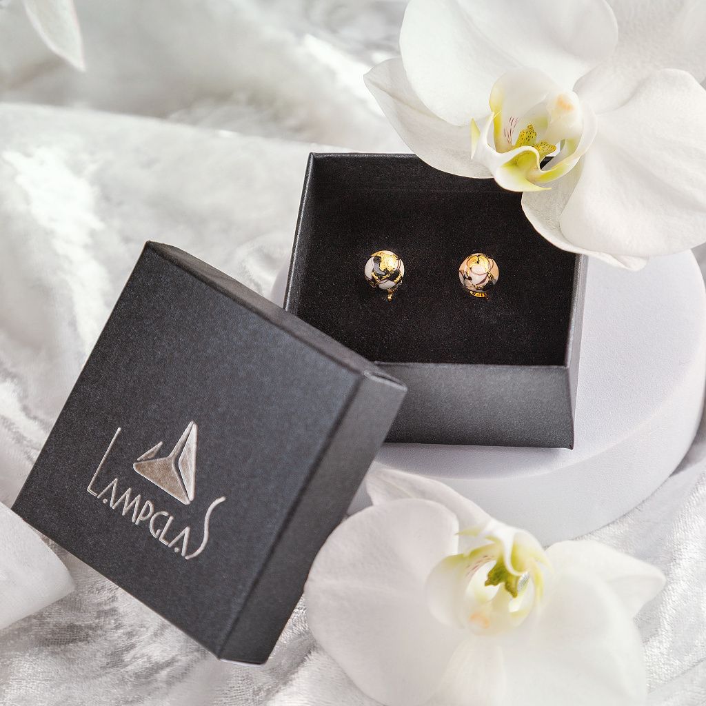 Ručně designované perly Lampglas, nad ohněm precizně vytvořené, nesou v sobě neopakovatelnou kresbu i hloubku. Zlaté akcenty se při dopadu světla rozzáří a zvýrazní Vaši tvář s přirozenou noblesou. Díky puzetovému zapínání z pozlaceného stříbra Ag 925/1000 působí náušnice čistě, decentně a přesto výrazně – jsou ideální volbou pro ženy, které milují detail a kvalitu.