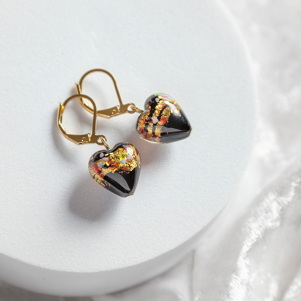 Náušnice se srdcem, v nichž se potkává ticho černé s jemným leskem zlata – jako drobný detail, který zůstává v paměti.