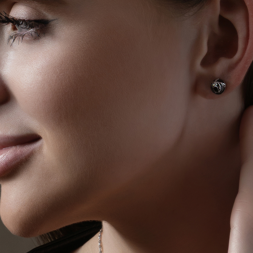 Náušnice Night Nude (puzeta) z kolekce Nude Muse v sobě nesou klid, hloubku i eleganci. Ručně designované perly Lampglas v sytě černém tónu jsou zdobené pravým ryzím stříbrem, které vytváří jemné světelné linky, jako by po perle přelétl stín měsíčního svitu.