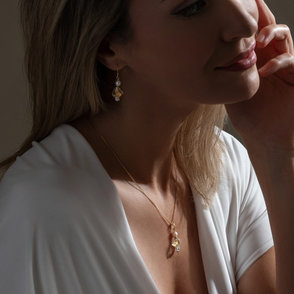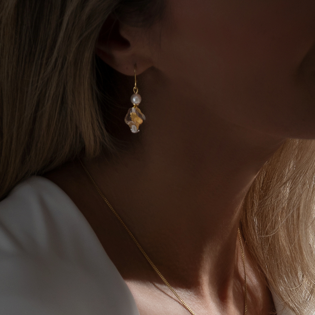 Říční perla dodává náušnicím měkkost a přirozenou ženskost, zatímco zlaté detaily podtrhují jejich luxusní charakter. Díky lehkosti a harmonickému tvaru se náušnice při pohybu jemně rozzáří a přirozeně doplní rysy nositelky.