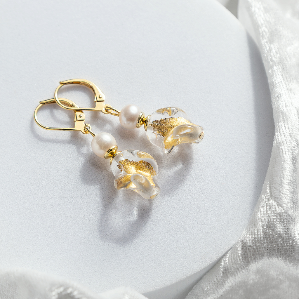 Jemné náušnice s ručně designovanou perlou Lampglas, v níž se třpytí 24karátové zlato, doplněné říční perlou. Nadčasová elegance s dotekem tiché noblesy.