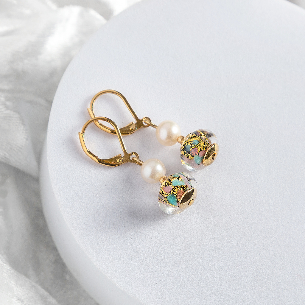 Každá perla Lampglas v sobě nese jemnou hru barev a zlatých odlesků, které připomínají uměleckou mozaiku zalitou světlem. Zlaté komponenty podtrhují jejich slavnostní charakter a dodávají náušnicím noblesu, která nikdy nepůsobí okázale, ale vždy výjimečně.