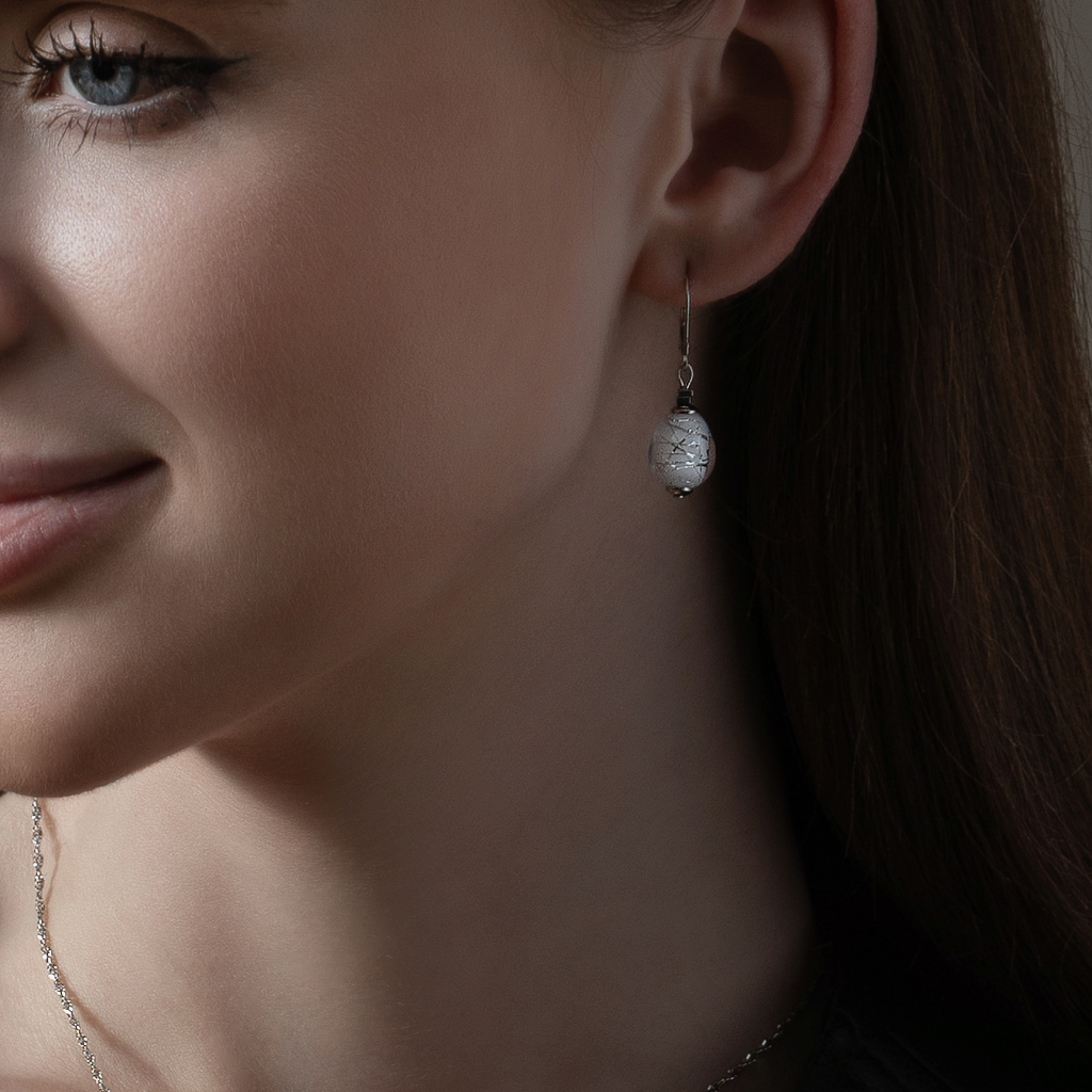 Jemné náušnice v ledově bílém tónu s nitkami ryzího stříbra – lehké, čisté a nadčasové.