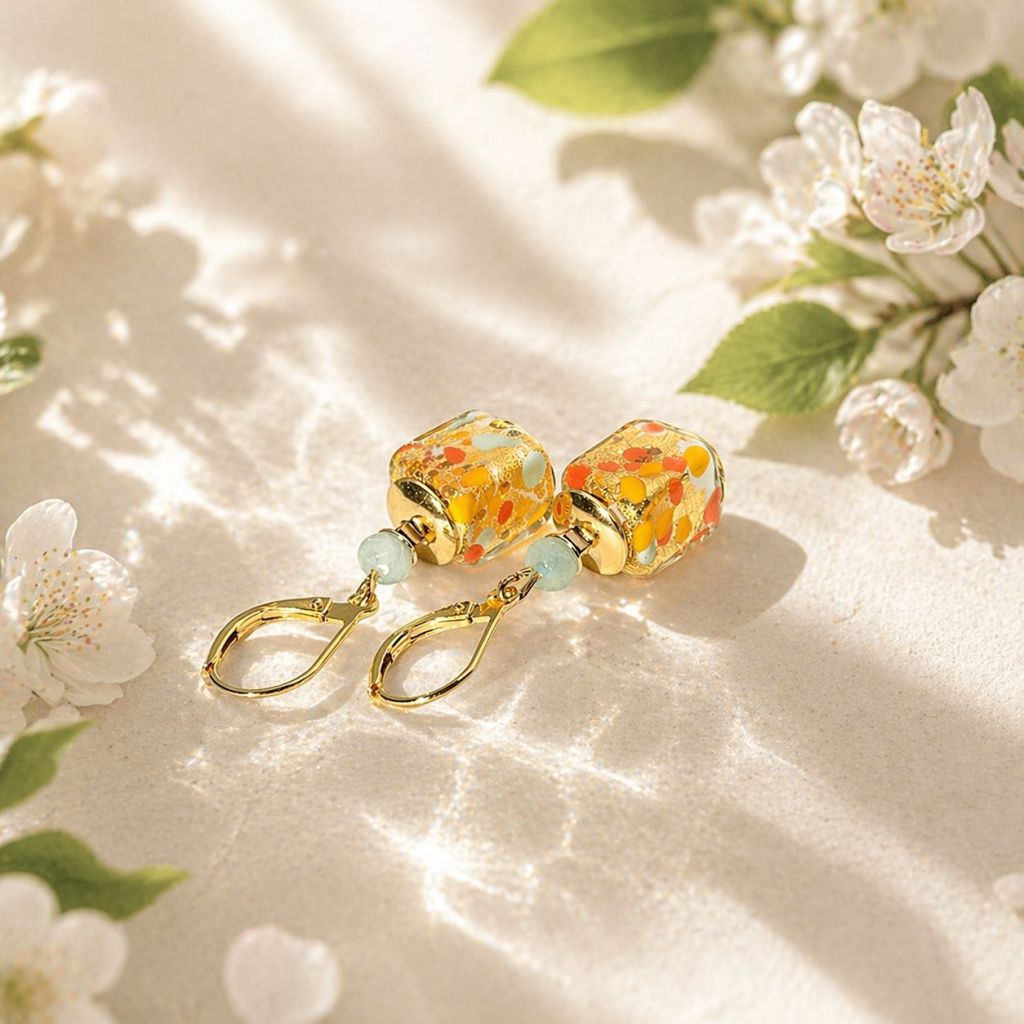 Ručně designované perly Lampglas v sobě ukrývají hravou mozaiku letních odstínů – teplé tóny slunce, jemné doteky přírody i svěží barevné akcenty. V jejich hloubce se třpytí 24karátové zlato, které dodává šperku hřejivost a nádech luxusu. Broušený achát přináší jemný kontrast a jiskru, která při každém pohybu zachytí světlo.