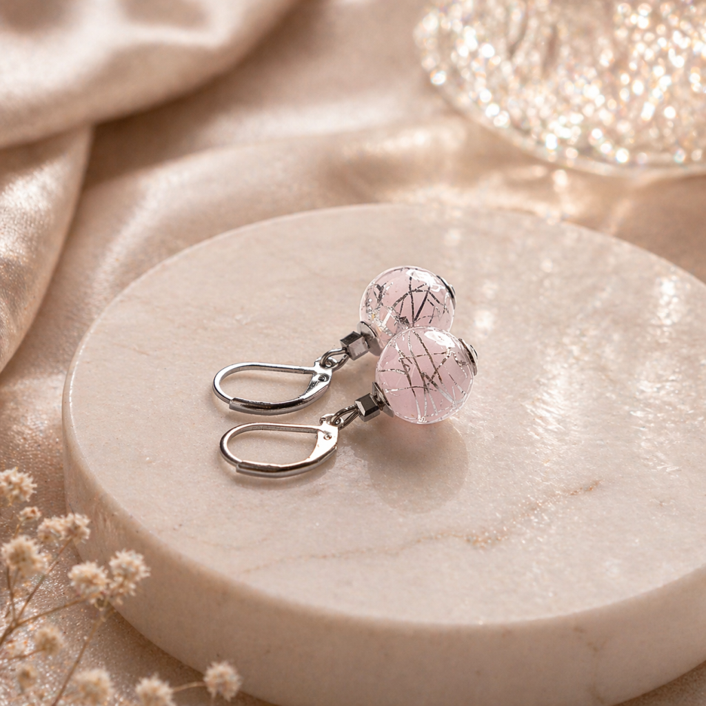 Náušnice Tender Rose s ručně designovanými perlami Lampglas s ryzím stříbrem ve skle. Jemný růžový třpyt vytváří elegantní šperk plný něhy, ženskosti a nadčasové krásy.