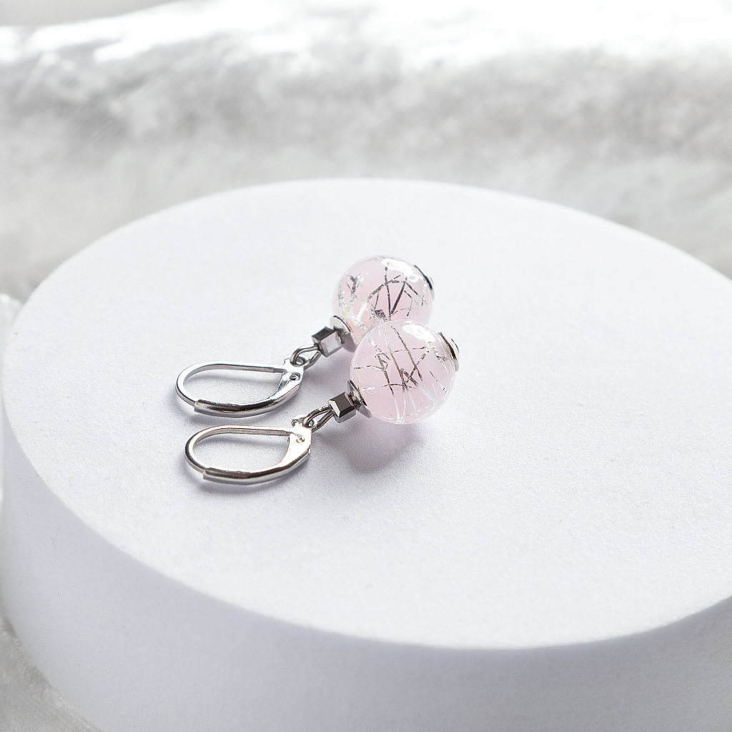 Dominantou náušnic jsou ručně nad ohněm vytvořené perly Lampglas, ve kterých se třpytí ryzí stříbro. Jemná kresba uvnitř perel vytváří fascinující hru světla a dodává šperku luxusní charakter. Každá perla je originál, a proto mají náušnice jedinečný a neopakovatelný půvab.