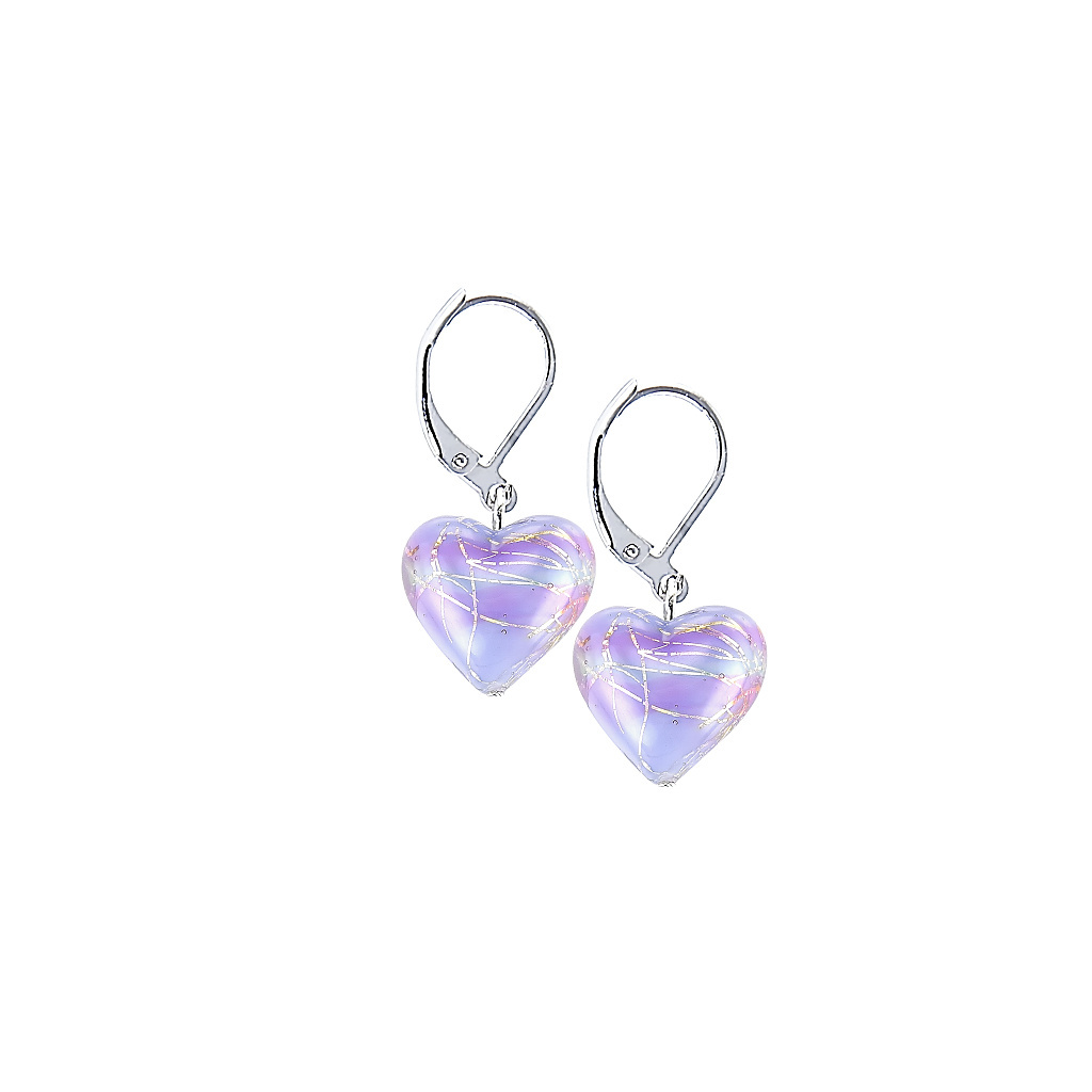 Jemné náušnice se skleněnými srdci v barvách levandule, zdobenými ryzím stříbrem, pro milovnici jižní Francie.
